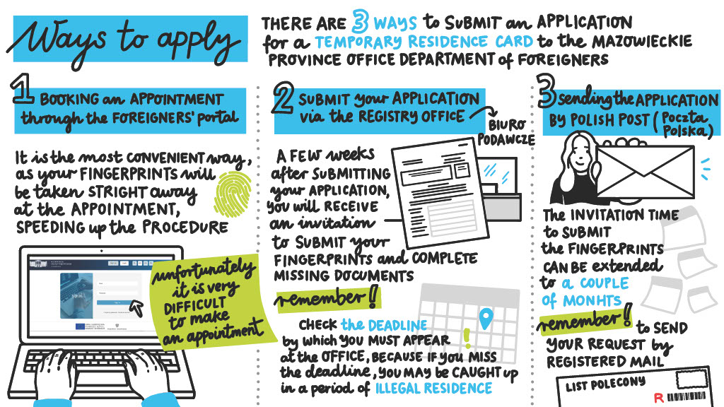 The application for a temporary residence permit is submitted in person, no later than on the last day of legal residence in Poland to a voivode having jurisdiction over place of residence (Wojewoda Mazowiecki).