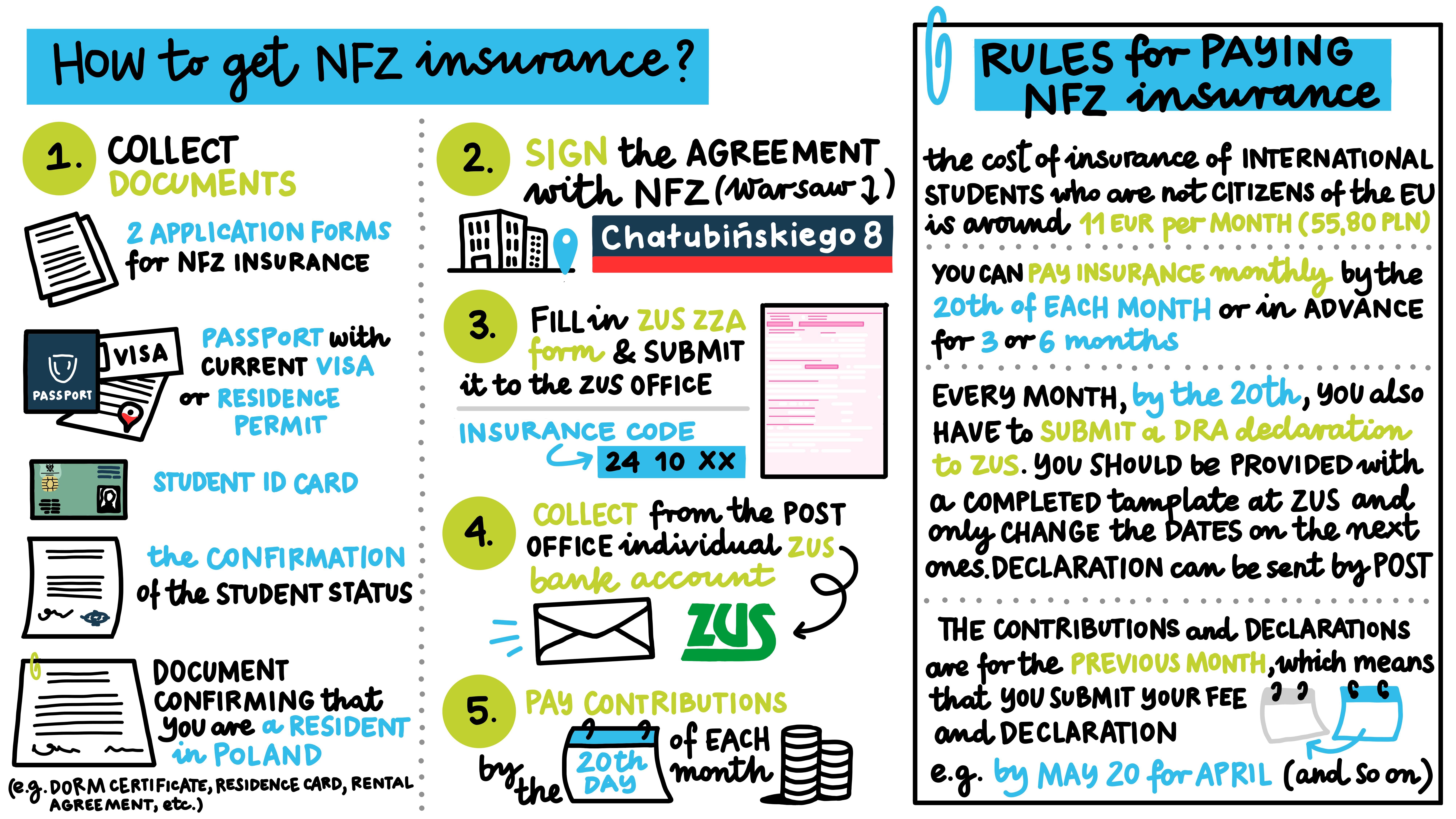 To be insured, you have to sign a contract with the National Health Fund (NFZ – Narodowy Fundusz Zdrowia) and submit a copy of the contract to the Student Welfare and Support Office along with: