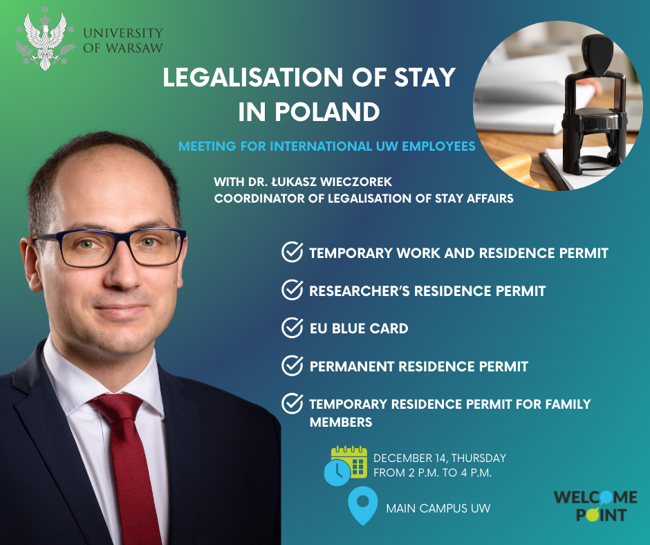 Welcome Point invites employees at the University of Warsaw to join the meeting on Legalisation of stay in Poland with Dr. Łukasz Wieczorek, coordinator of legalisation of stay affairs. Dr Wieczorek has 12 years of experience in the field of legalisation of residence in Poland and temporary residence permits for foreigners and will share his expertise with you and answer any questions you may have.