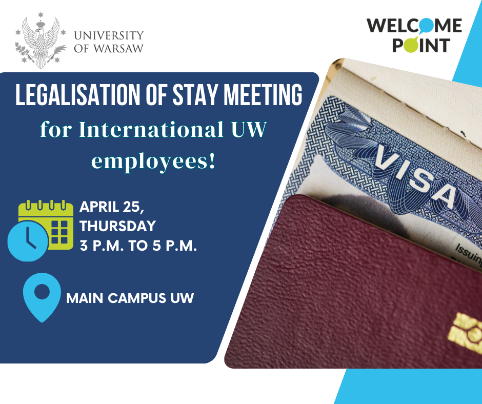 Welcome Point invites employees at the University of Warsaw to join the meeting on Legalisation of stay in Poland with Dr. Łukasz Wieczorek, coordinator of legalisation of stay affairs. Dr Wieczorek has 12 years of experience in the field of legalisation of residence in Poland and temporary residence permits for foreigners and will share his expertise with you and answer any questions you may have.