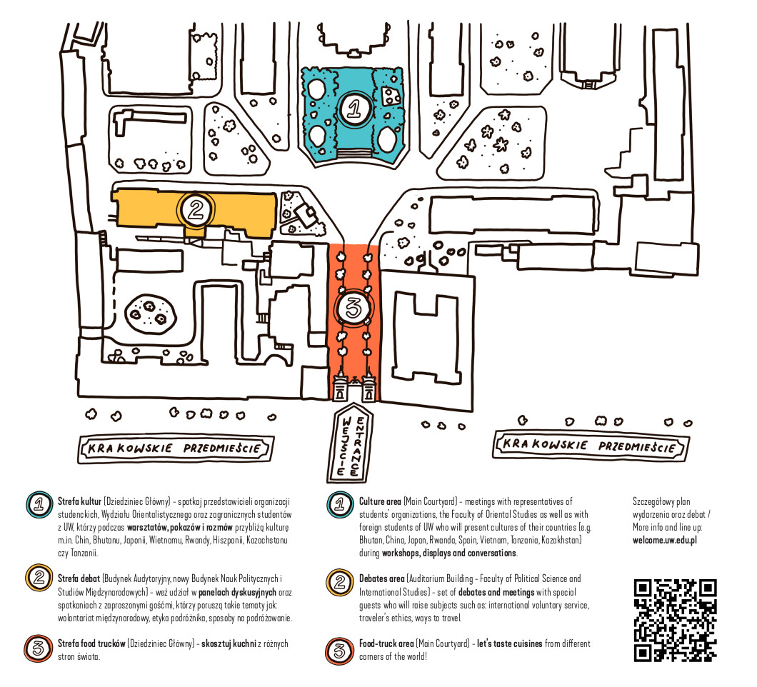 • Strefa Kultur – od godziny 12:00. To tutaj nasi studenci zaproszą Was do podróży po swoich krajach, do zapoznania się ze swoimi zwyczajami i językami. W dwudziestu namiotach ulokowanych przed budynkiem Starego BUWu będziecie mieli możliwość „odwiedzenia” kilkudziesięciu państw rozsianych po całym globie! Czekają Was zarówno warsztaty ze składania origami, jak i nauka podstawowych zwrotów w różnych językach, degustacja lokalnych potraw i wiele, wiele więcej.