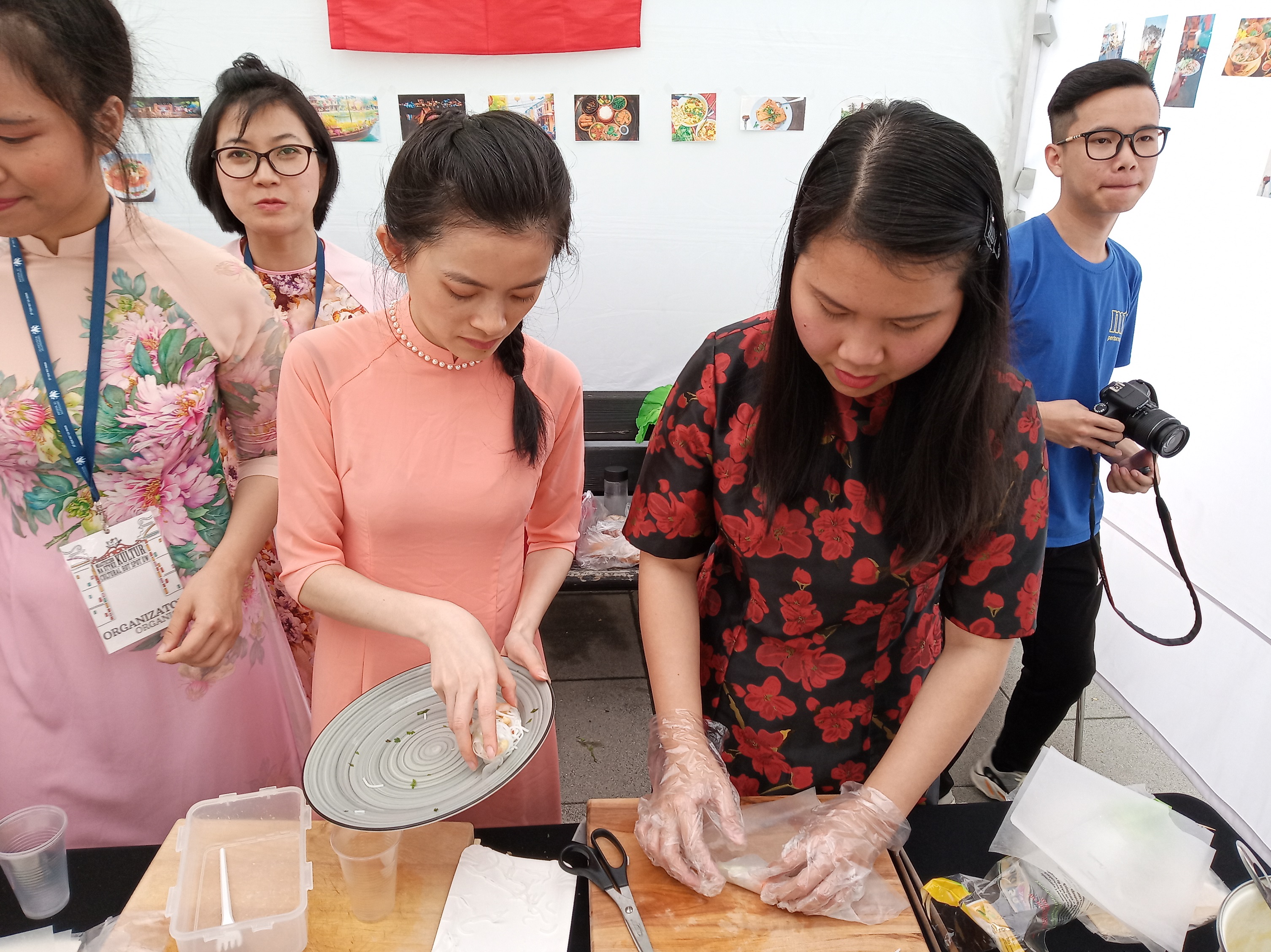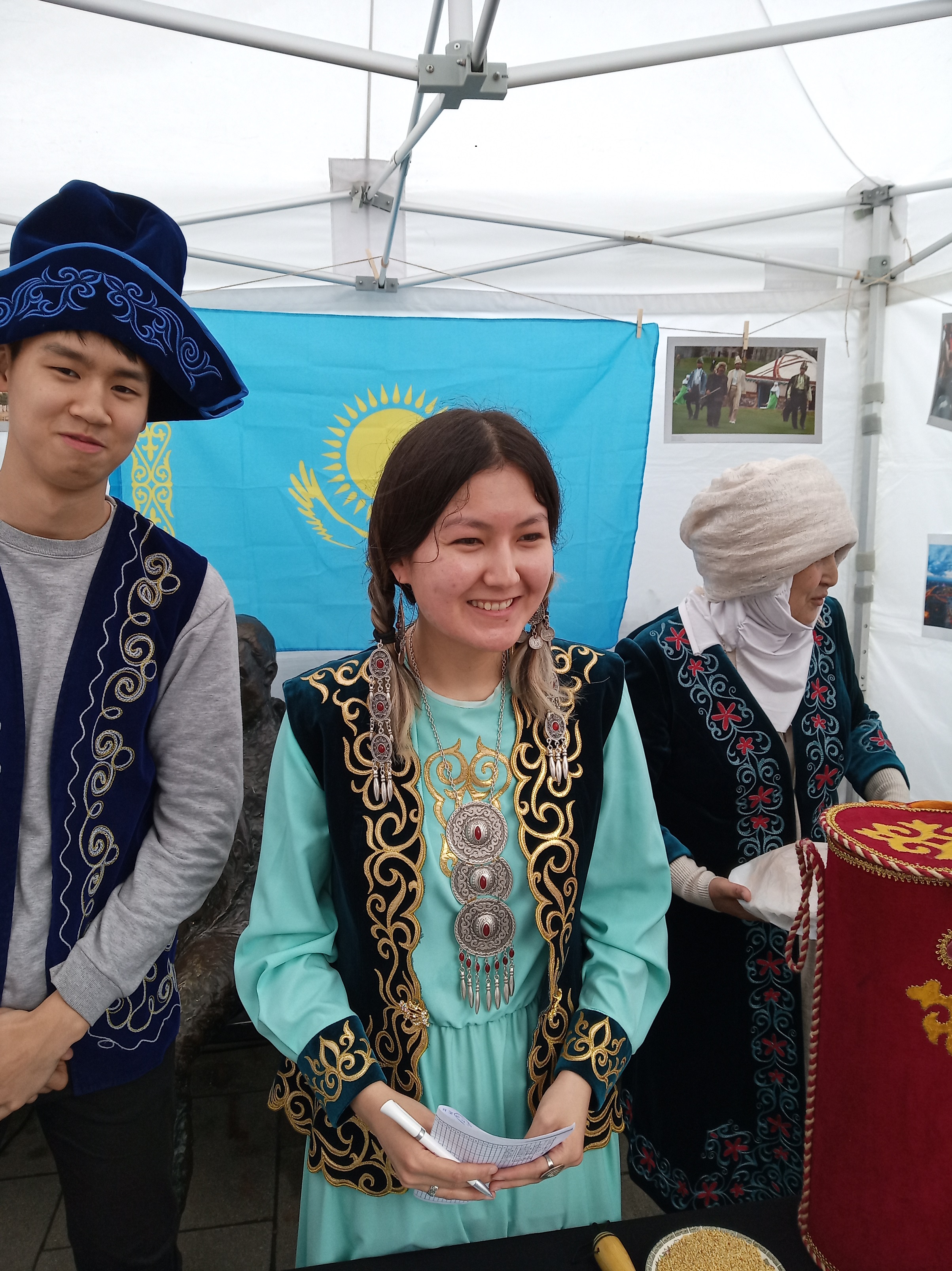 We launched at 10:30 am when first debate (Multiculturalism in Canada, Swizterland, and Australia) started. Half hour later food-trucks arrived and not so long after you could see long queues for Korean, Georgian, Chechen food, and donuts. At 12:00 culture area begun with more than 50 of our volunteers representing 12 different countries. For almost 6 hours they were presenting their fascinating cultures to us in multiple ways, through: food, clothes, music, mini-workshops, and language. Visitors had an opportunity to fold their own origami, write their names in Chinese, play traditional Kazakh instrument – dombra, taste cuisine from every corner of the Earth, see traditional belly dance, and much, much more.