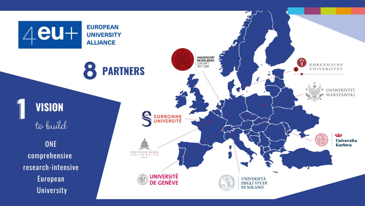 The 4EU+ Alliance, which consists of six well-established research universities, responds to the call of the European Commission regarding the European Universities Initiative. The mission of 4EU+ is to develop a barrier-free and continuously deepening cooperation in education, research, and innovation within the Alliance. Through this collaboration and working in partnerships, the Alliance serves society to the highest level with our core values, e.g. academic and research freedom, collaboration in an interdisciplinary approach, integrity, creativity and openness, and internationalisation.