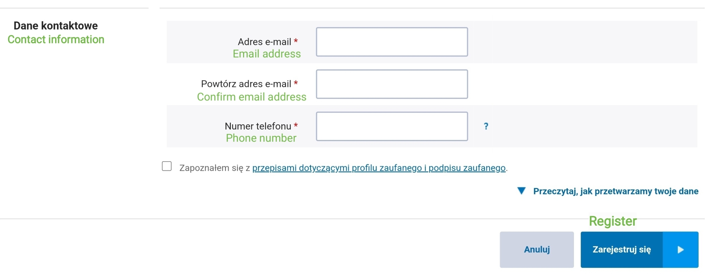 Scroll to the bottom of the pz.gov.pl website and choose Załóż Profil Zaufany i potwierdź W PUNKCIE POTWIERDZAJĄCYM. You will be asked to input your login information, your personal information, and your contact information. Below you will find screenshots from the website with translations.