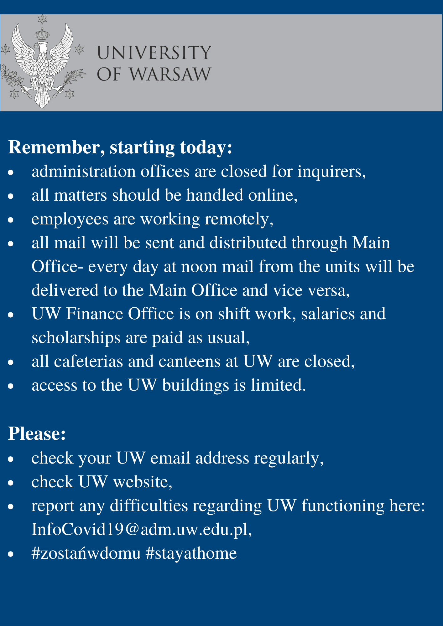 In relation to the Rector’s statement regulating the functioning of UW, due to the state of epidemic emergency in Poland, from 16th of March 2020 the Welcome Point office will be closed, until further notice.