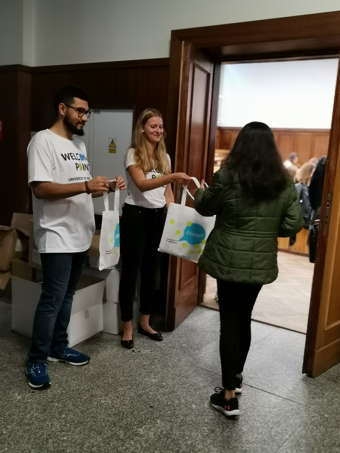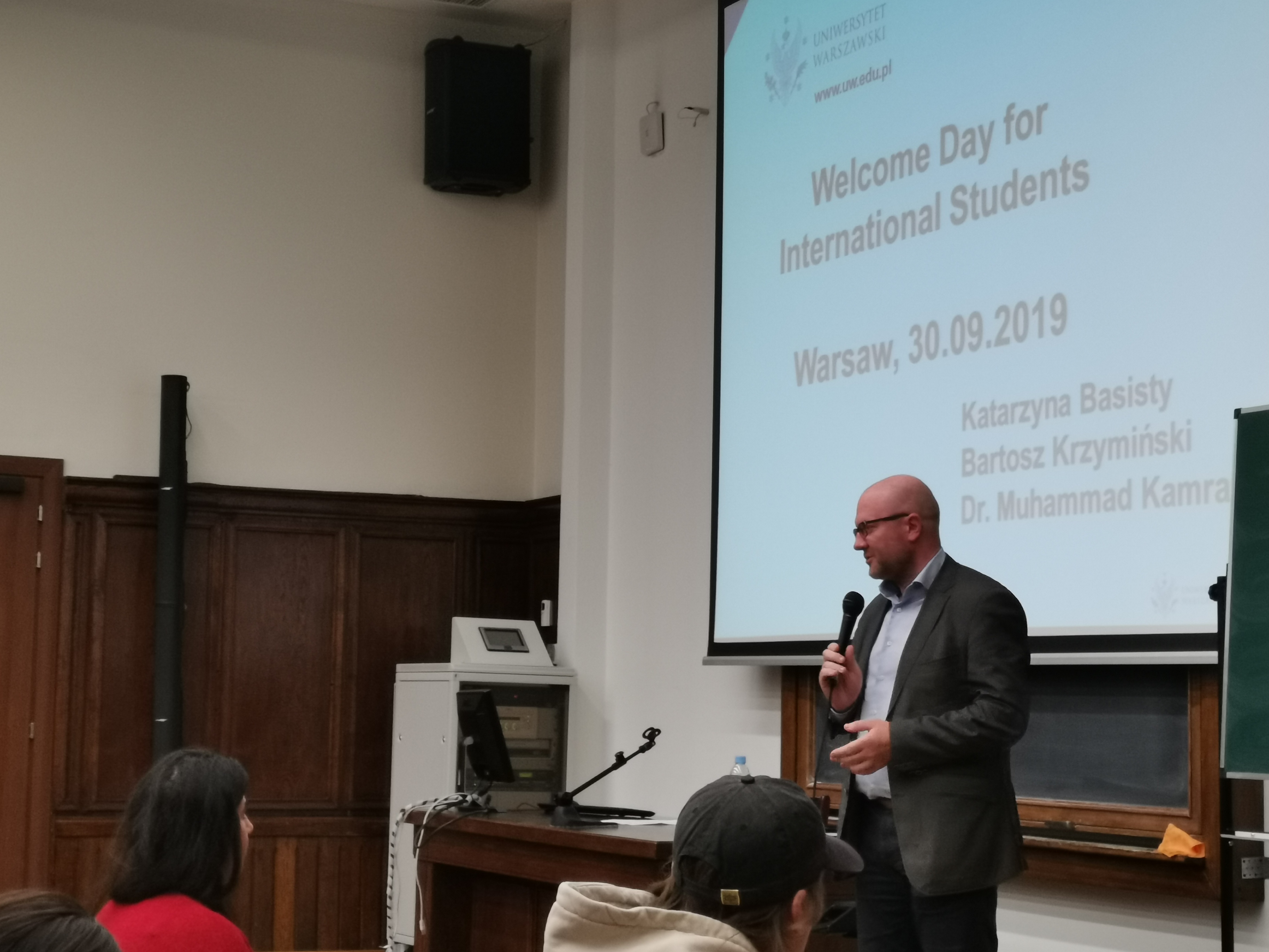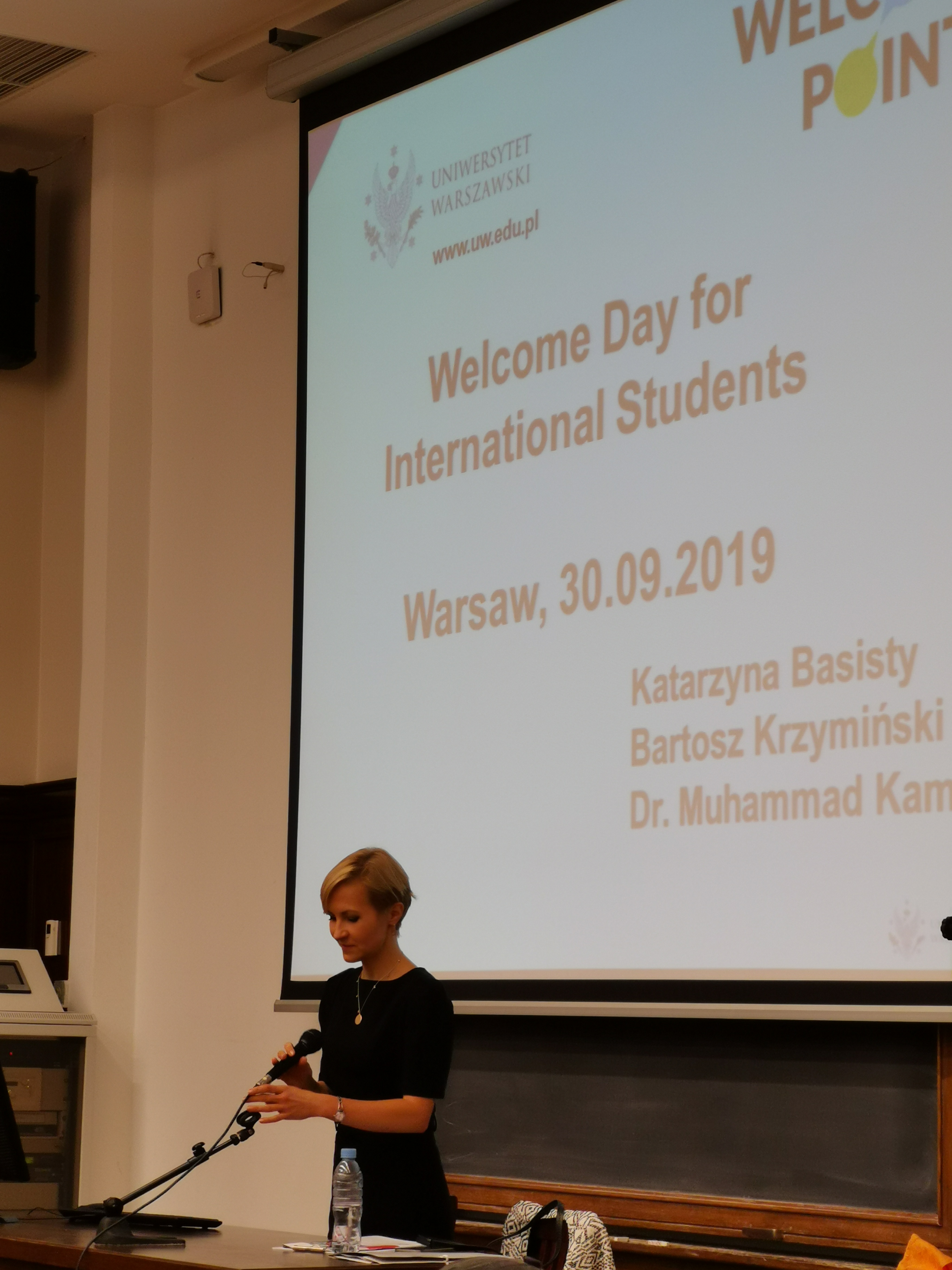 Yesterday was an official beginning of the academic year 2019/2020, but long-term international students have already started! On Monday (30.09.2019) Welcome Point organized two meetings – one held in English, one in Polish. During meetings students have learned the most important things about the University and Poland. Also, three students had a chance of winning one of UW gadgets: a navy blue cap, a travel mug or a pendrive.