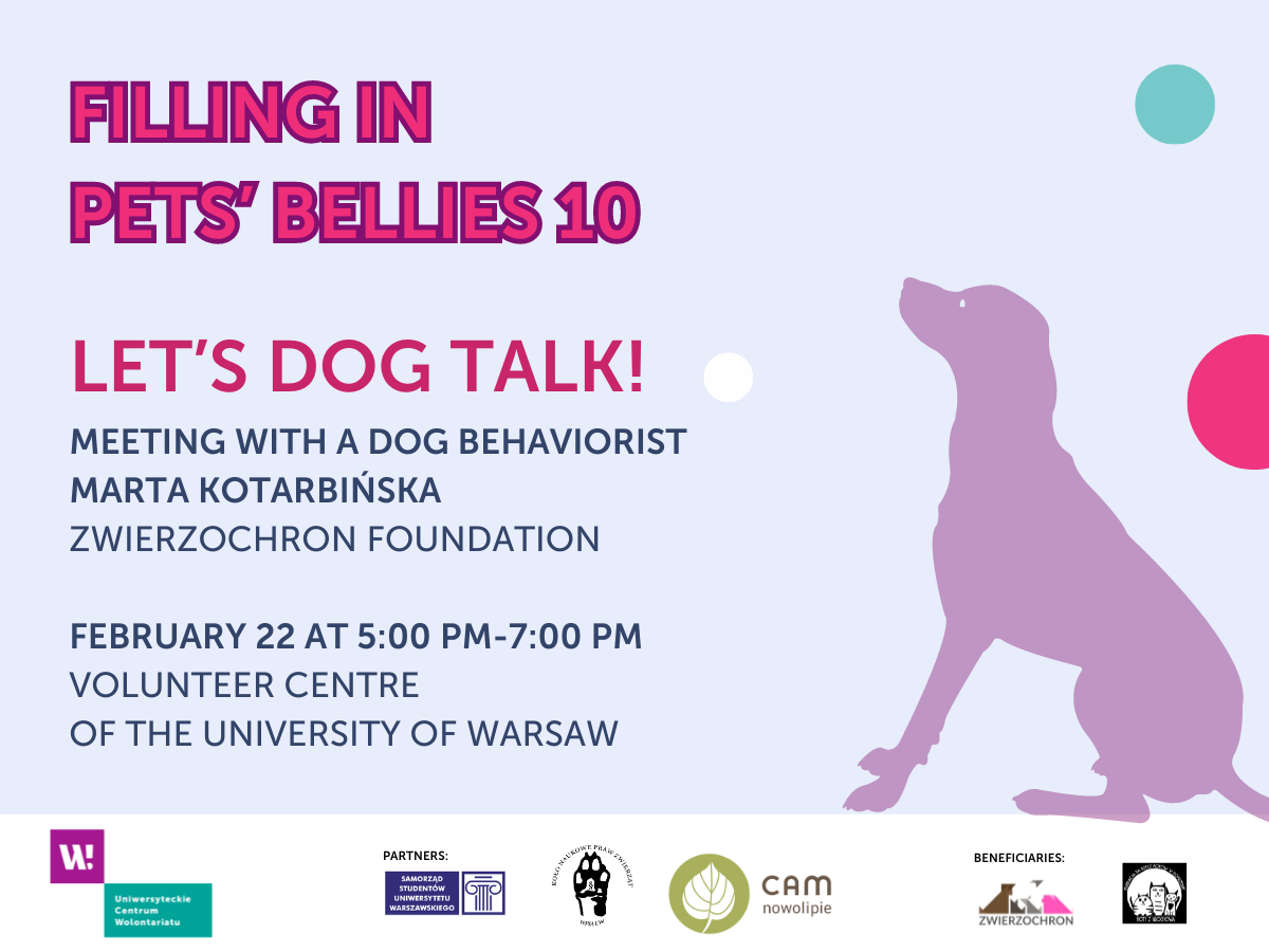 This year, as every previous one, the Volunteer Centre of the University of Warsaw would like to invite you to support cats and dogs from the shelters! But Filling in pets’ bellies is not only a food collection. We also organize workshops and educational meetings. This time we invite you to an interesting meeting with a dog behaviorist.
